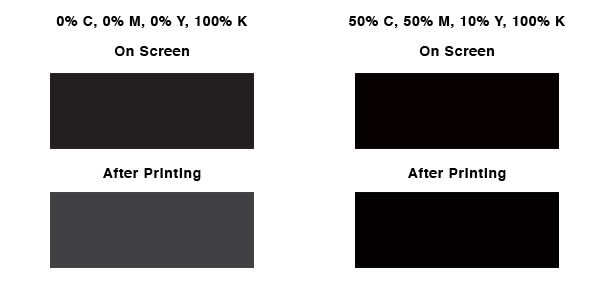 FOR SOLID BLACK BACKGROUND: When you want an area of solid black within your document, use Rich Black, as represented by C:50% / M:50% / Y:10% / K:100%, because using 100% black (K) only and not a solid saturated black will result in a dull black.