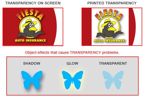 While we understand that using these effects can sometimes enhance the appearance of your design, the best way to avoid transparency problems is to not use the effects that cause them. However, if you choose to use a transparency, we recommend that you flatten your transparency. The following Instructions may also help you resolve any transparency problems.