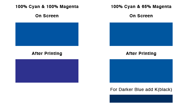 The color blue consists of a color combination of Cyan and Magenta values. The higher the Magenta value, the higher the risk of your blues turning purple. To avoid your blues from turning purple we recommend the Magenta value be at least 35% lower that the Cyan value. For example: 100% Cyan and 100% Magenta equals Purple. Although this combination looks blue on your computer screen, it will print purple.